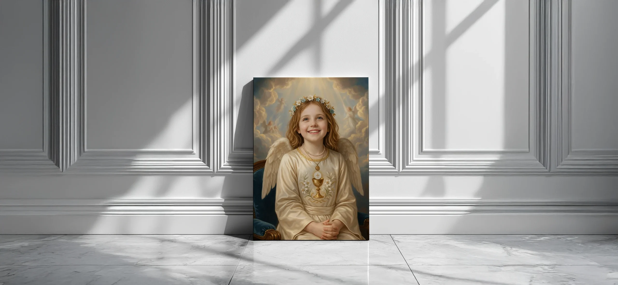 Pierwsza Komunia Święta to moment pełen czystości, światła i dziecięcej radości. W HappyPortret wierzymy, że taka okazja zasługuje na oprawę godną małej księżniczki. Nasz personalizowany portret „Dziewczynka w Wianku” to nie tylko obraz – to brama do magicznego, anielskiego świata, w którym Twoje dziecko staje się centralną postacią.